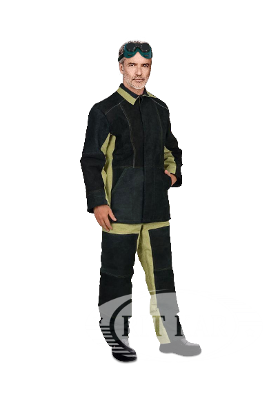 Куртка с потайной застежкой на пуговицы, с двумя боковыми карманами в швах. На спине вентиляционные отверстия. Брюки с застежкой на пуговицах. На полочках, спинке, передних, задних частях рукавов, передних половинках брюк настрочены накладки из кожевенного спилка высокого качества. Обеспечивает защиту при работе с повышенными температурами: теплового излучения, искр и брызг расплавленного металла, а также при контакте с нагретыми поверхностями до 100 С и конвективным теплом.
